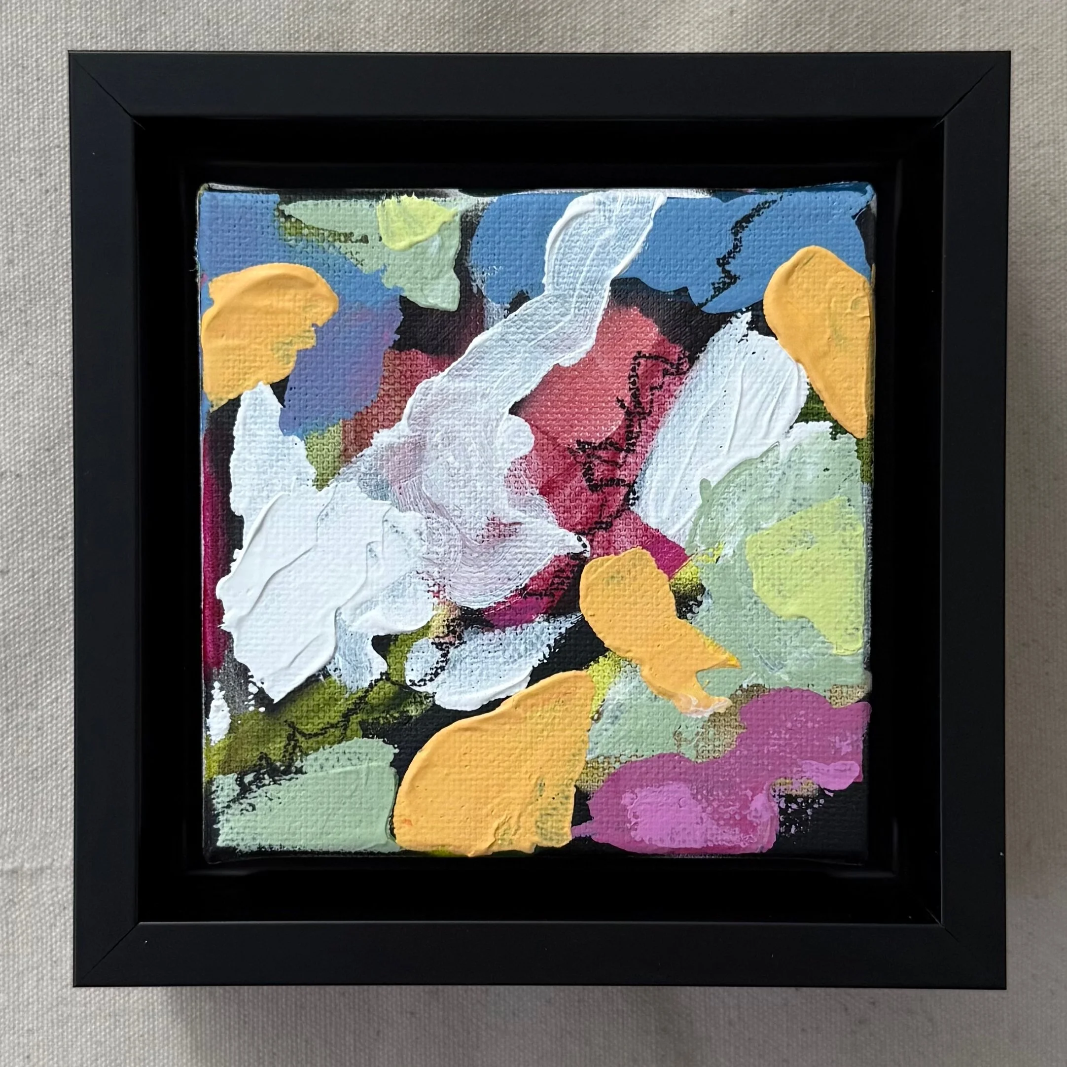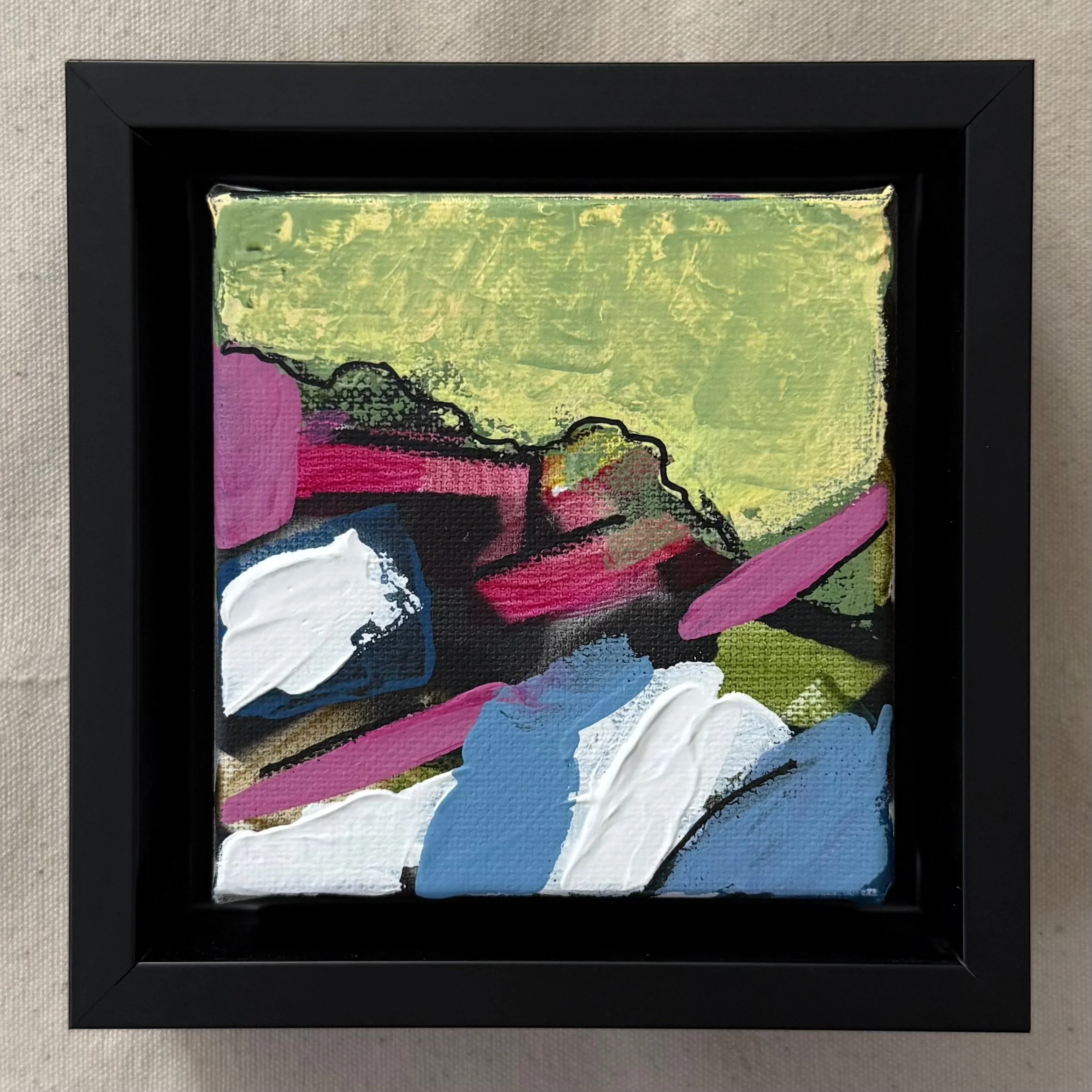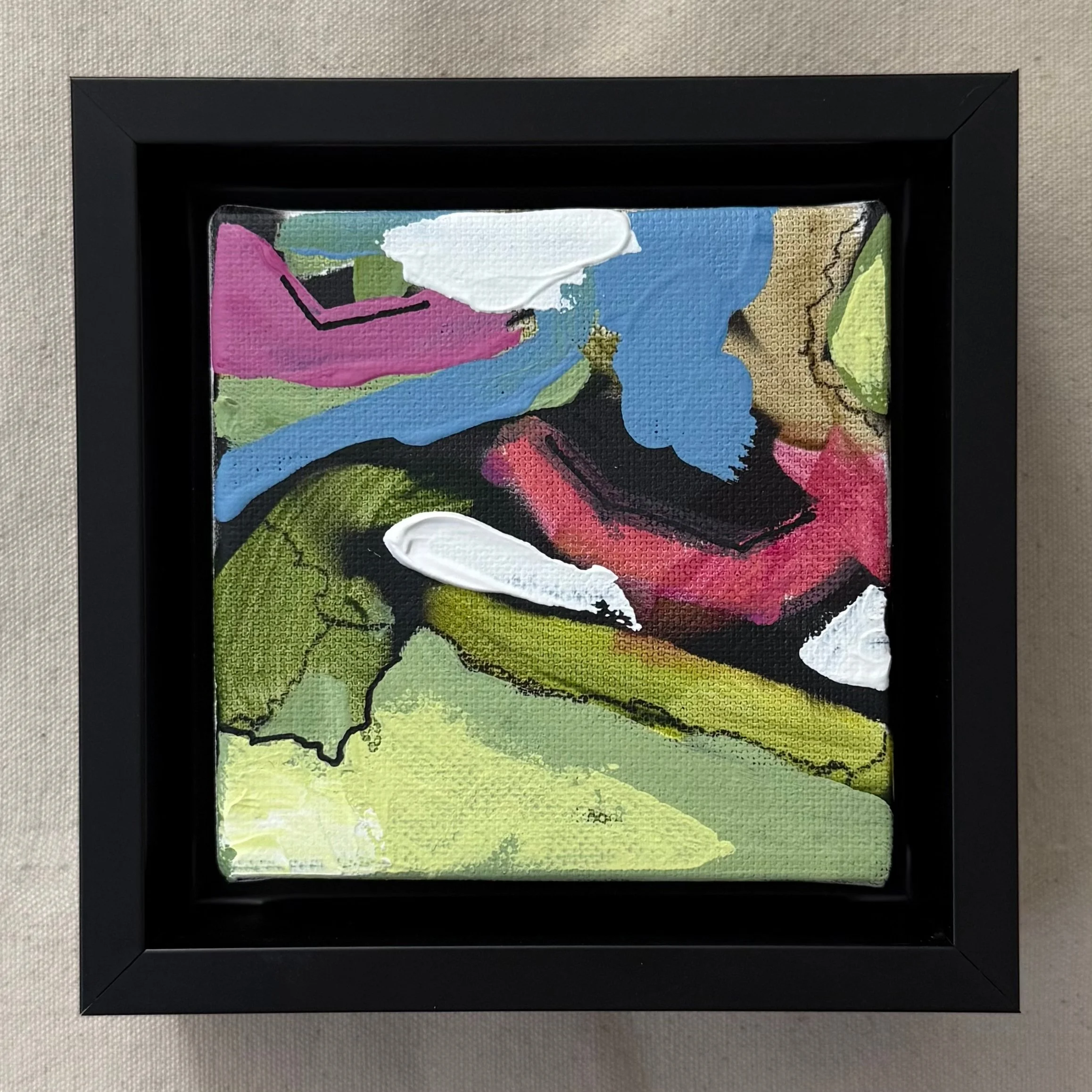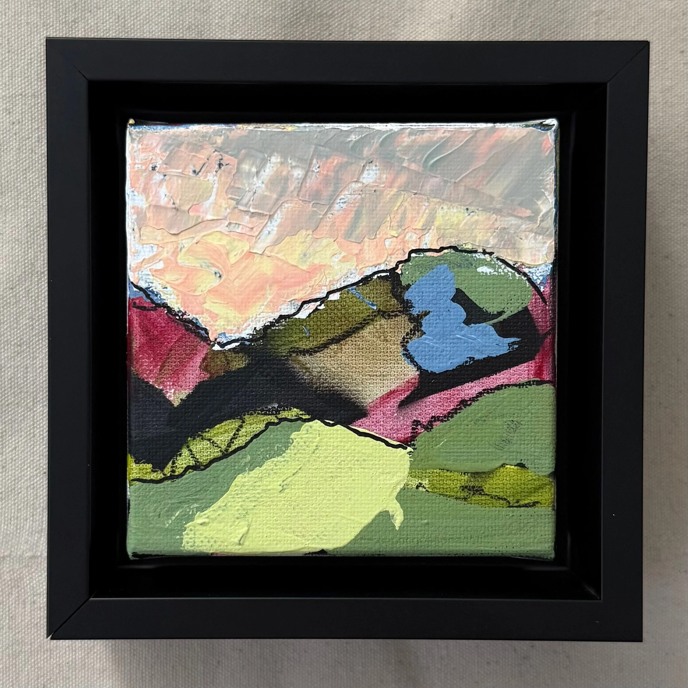 A series of 9 small canvases, inspired by the landscape. Acrylic on canvas. 4”x4”. Black float frame included.