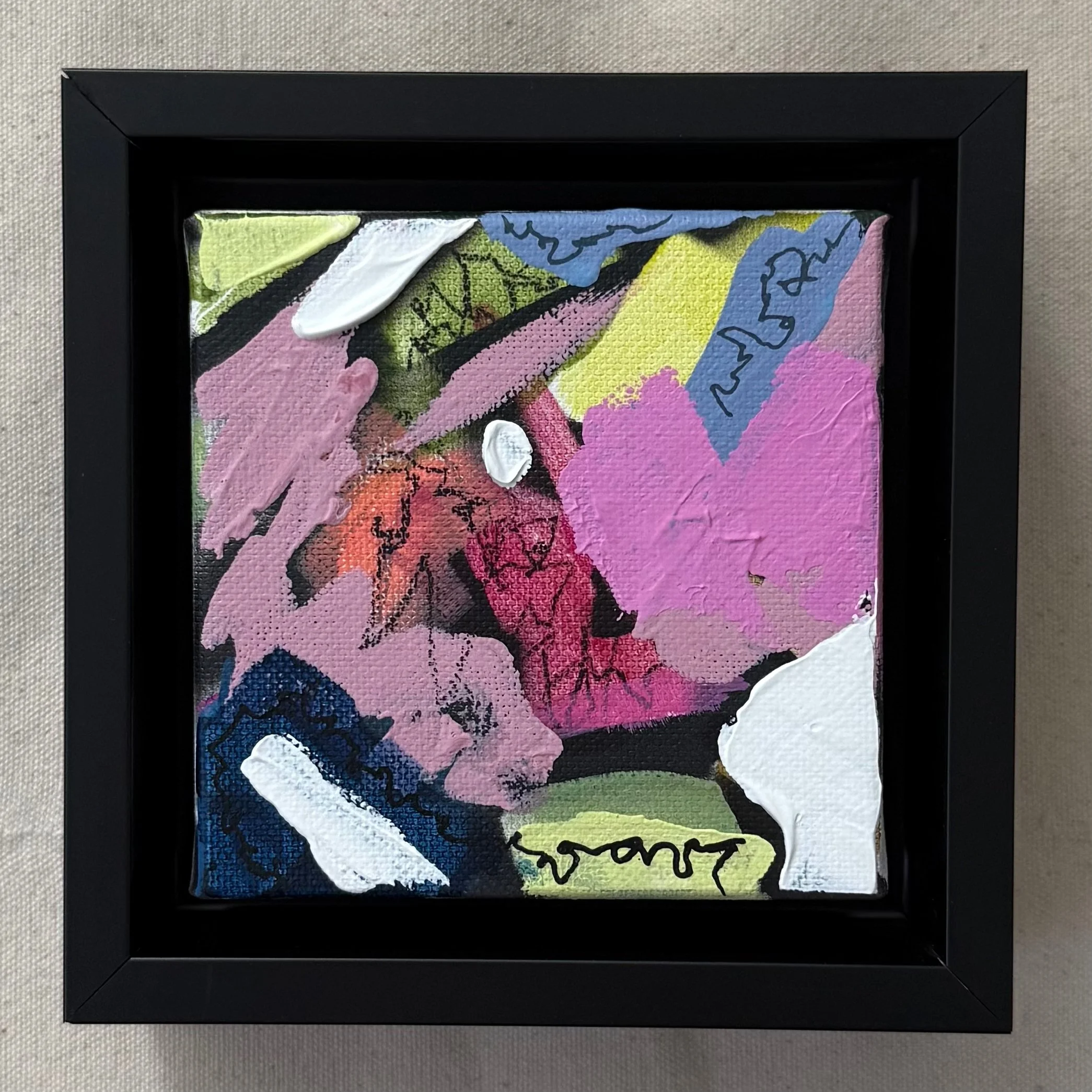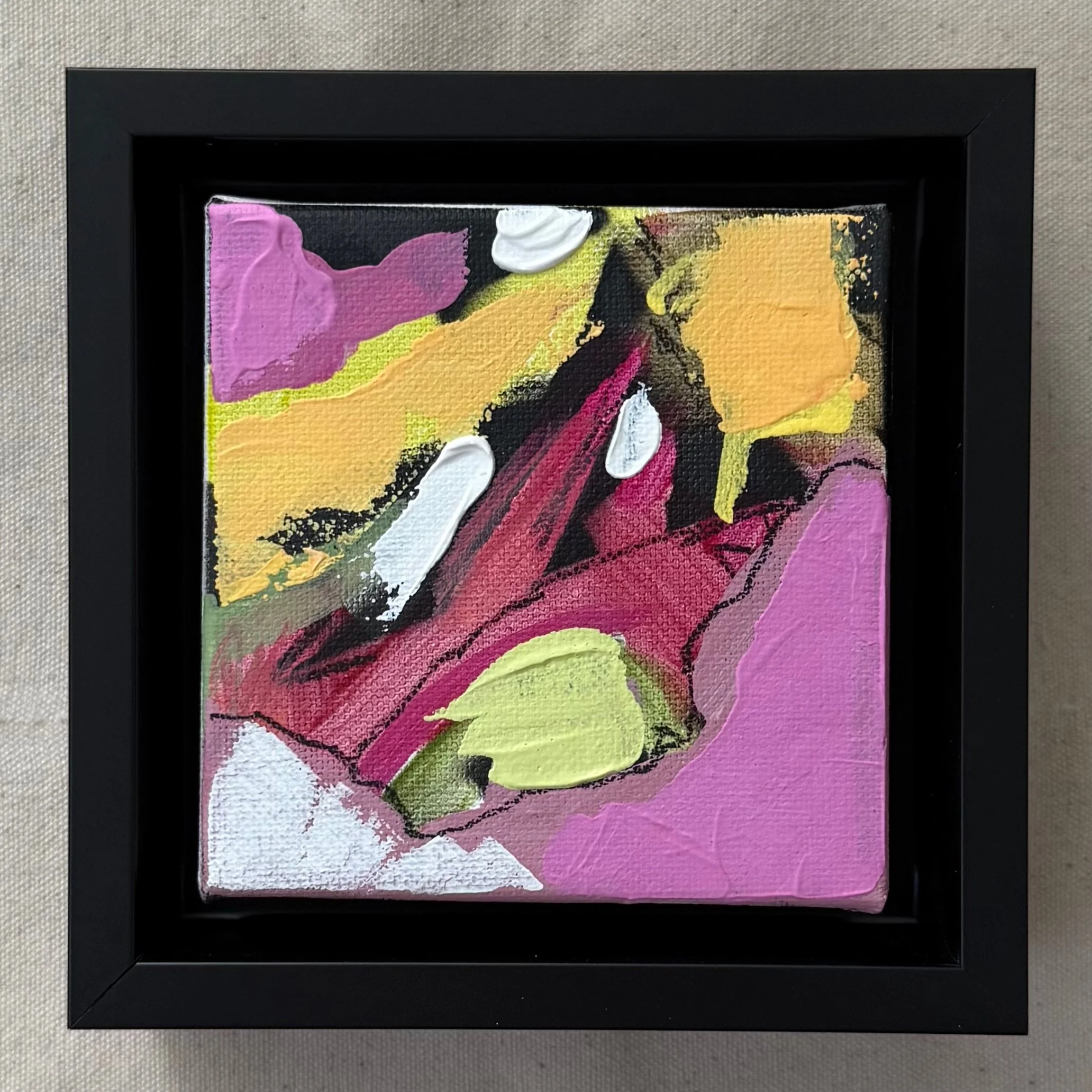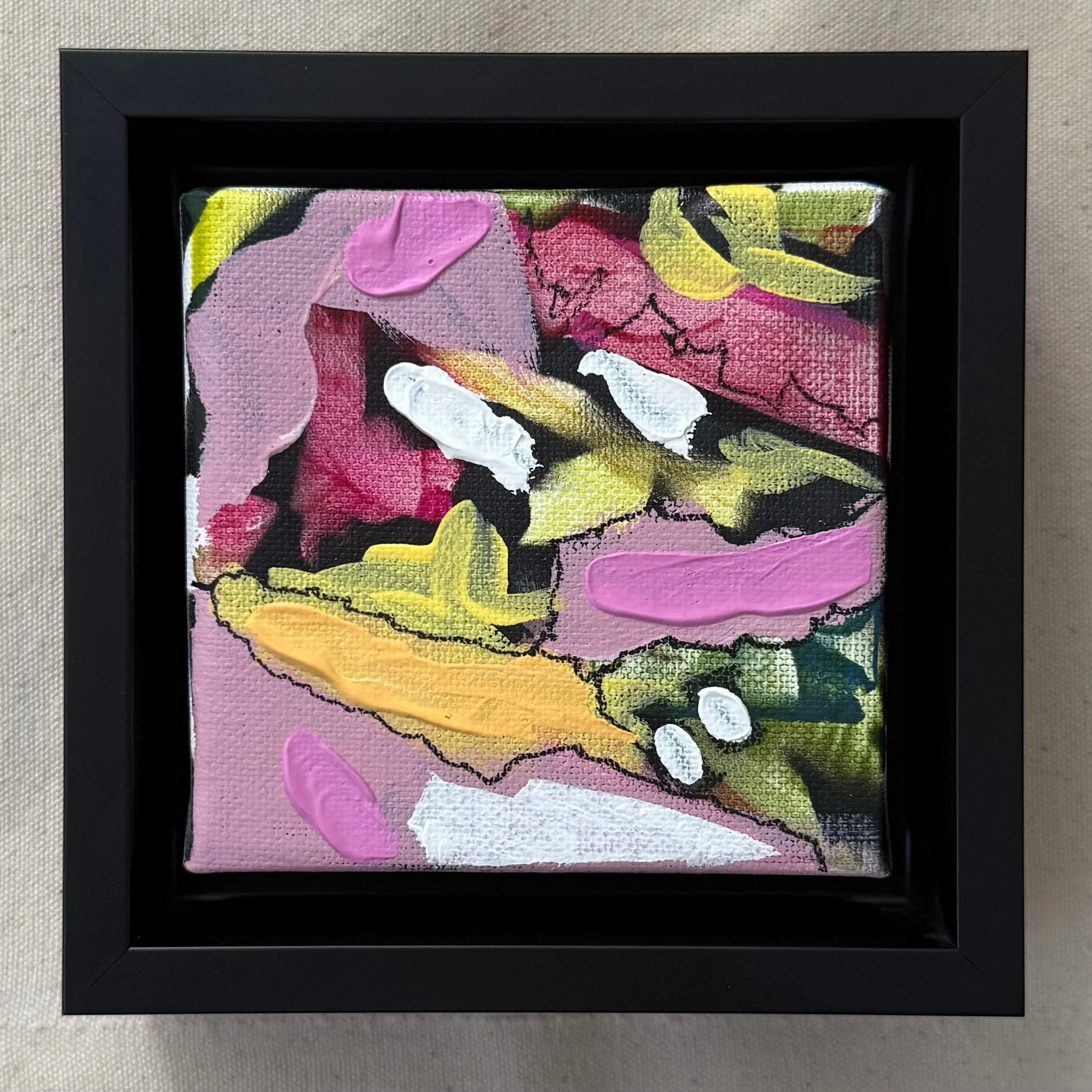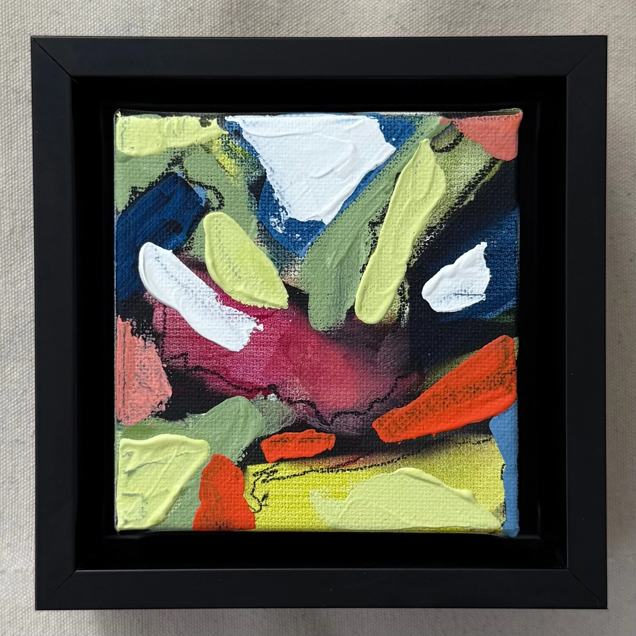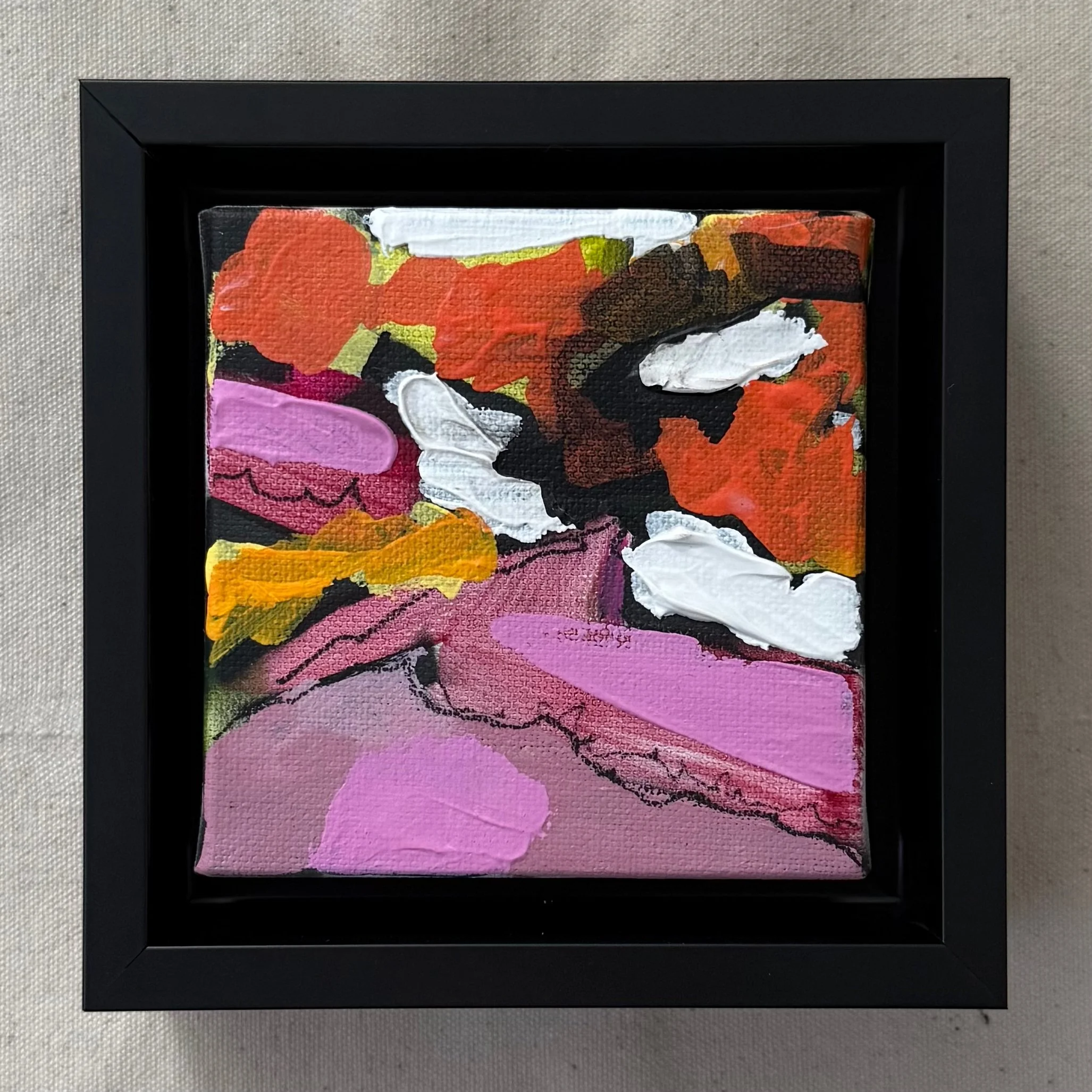 A series of 9 small canvases, inspired by the landscape. Acrylic on canvas. 4”x4”. Black float frame included.